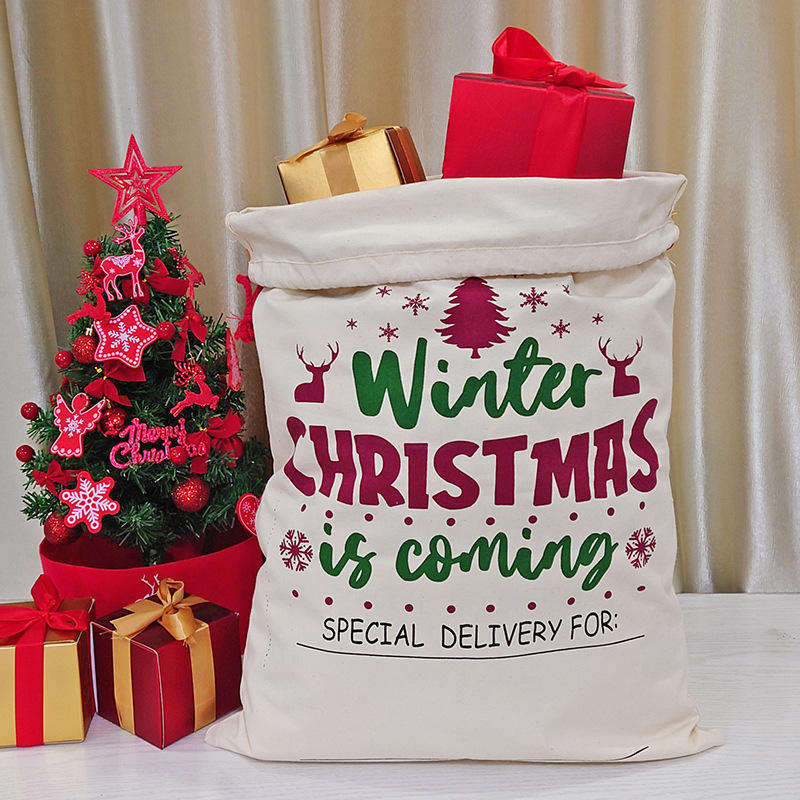 Custom Recycled Reusable 12Oz 16Oz Thick 100% Organic Cotton Christmas Canvas Drawstring Bag For Gift Packaging